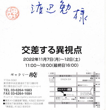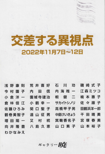 2022-10-27 グループ展「交差する異視点」(11/7〜11/12 東京銀座6丁目ギャラリー暁) 畏友の高橋甲子男画伯の作品展示があるとのこと。歌舞伎見物(十三代目市川團十郎白猿襲名披露・顔見世興行)のついでにでも寄ってみるか。何しろ、東京に出て帰って来るだけで交通費がけっこうかかるのである。